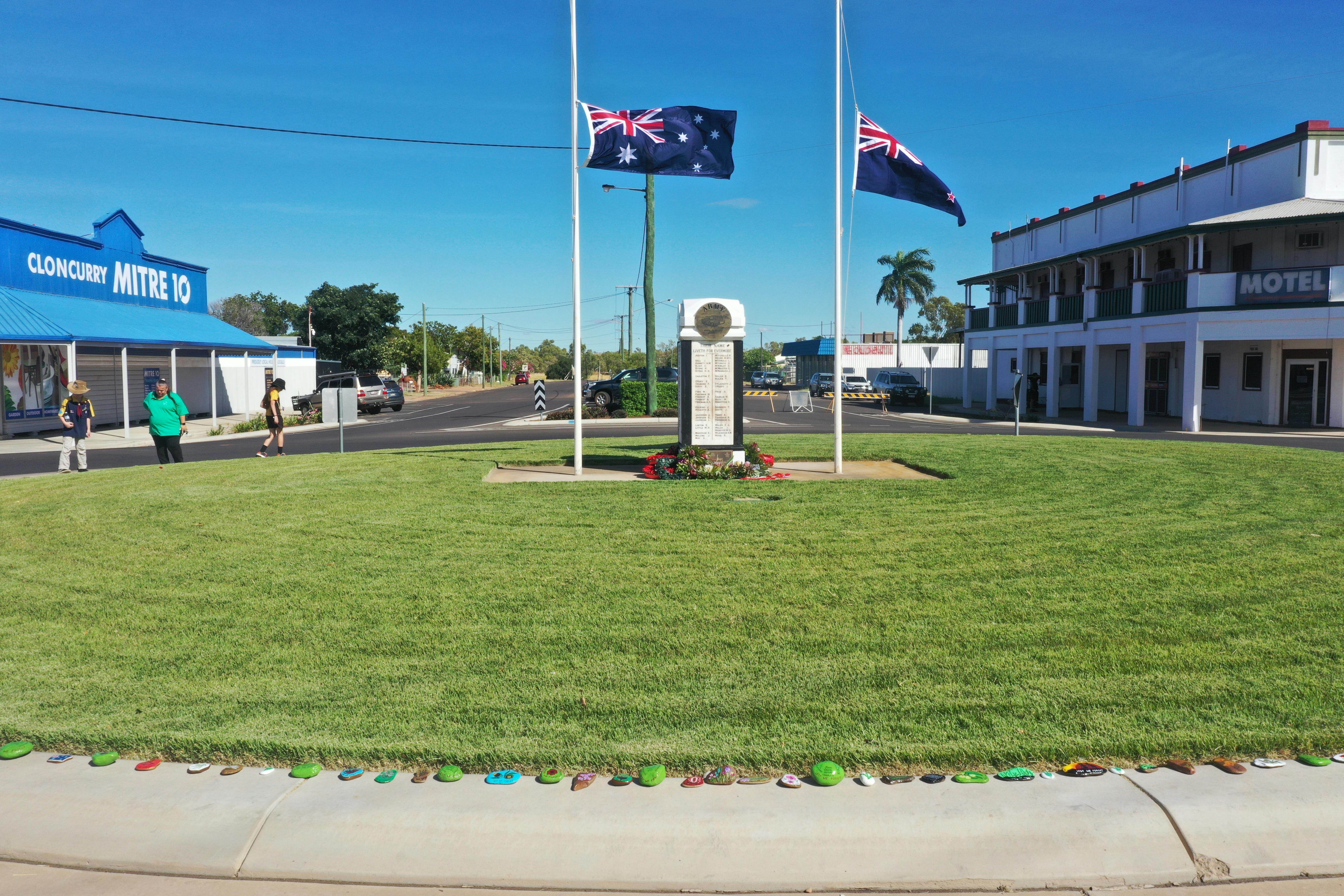 The Cloncurry War Memorial is located at the intersection of Sheaff and Scarr streets. The memorial originally included four clocks - one on each side of the pedestal. These have been replaced with metal circles paying tribute to the RAAF, Navy, Army and Nursing services. The memorial was installed by the Returned Sailors Soldiers Imperial League of Australia. His Excellency the Governor General, Lord Stonehaven, unveiled the memorial on 26 August 1927. He was returning from a short holiday in Normanton where he was engaged in bird watching, duck shooting and fishing, taking advantage of the new QANTAS airline trips to the gulf. Later that year, the memorial clock was handed over to the council to ensure its ongoing maintenance. In 1939 the Cloncurry Shire Council built a new War Memorial Hall, further along Scarr Street. From that time on, ANZAC commemorations were able to proceed to the hall for refreshments.